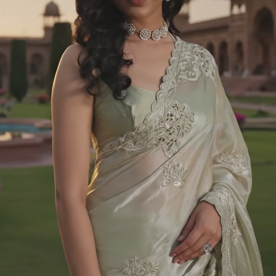 Elevate your ethnic wardrobe with this elegant sage green shimmer saree, designed with intricate floral embroidery and delicate bead embellishments. The soft, lustrous fabric drapes beautifully, while the heavily embroidered scalloped border adds a regal finish. Paired with a matching unstitched blouse piece, this saree is perfect for weddings, festive celebrations, receptions, and special occasions.