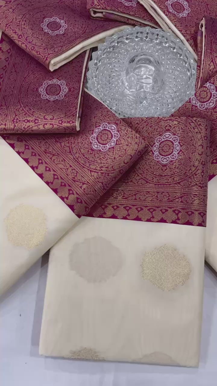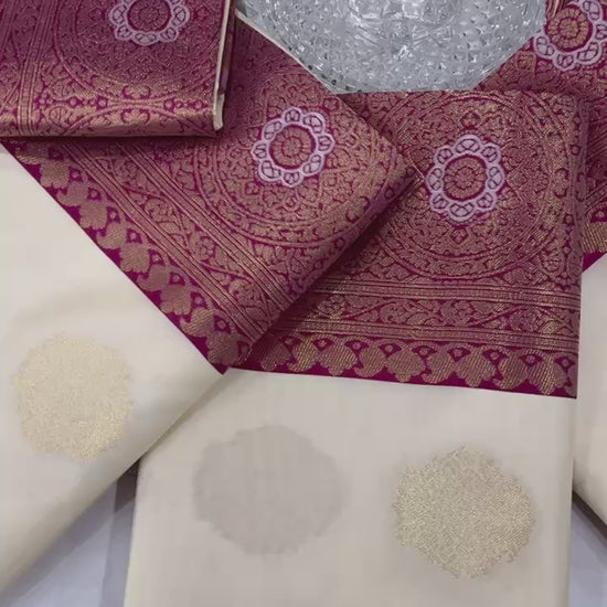 +Step into timeless elegance with this Royal Cream Banarasi Silk Saree. The rich golden zari weaving on the maroon border gives a classy and royal look. Yeh saree traditional functions, weddings aur festive occasions ke liye perfect choice hai.