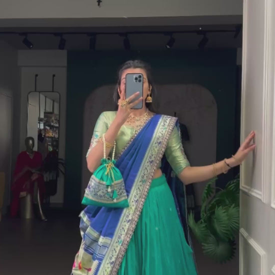 The lehenga comes in a vibrant green shade with a beautifully detailed woven border that adds a traditional and luxurious touch. The blouse (choli) is perfectly matched to enhance the overall royal look. The royal blue dupatta with intricate border detailing completes the outfit with elegance and grace.