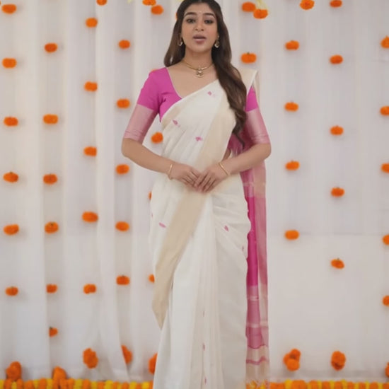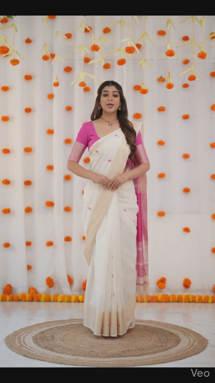 KERALA KASAVU Off-White & Pink Saree with Woven Motifs – Elegant Festive Wear
