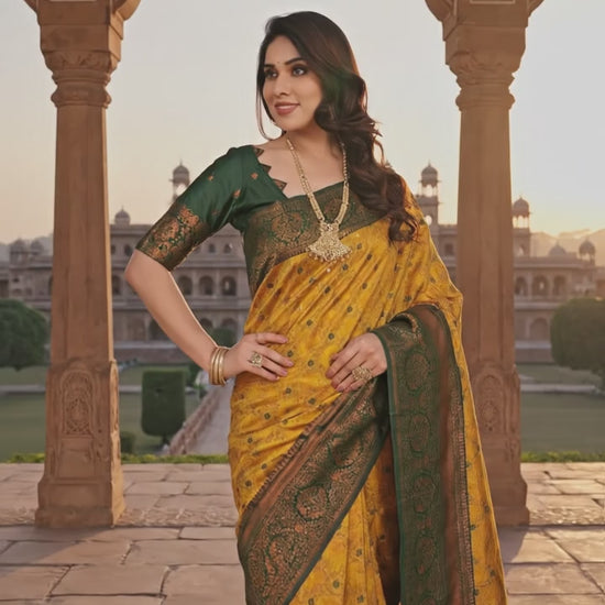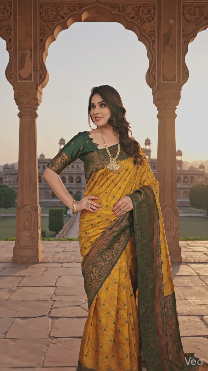 +he soft silk blend fabric drapes effortlessly, making it ideal for long festive celebrations, weddings, and special occasions. The contrasting teal blue blouse adds a royal touch, while the subtle floral motifs elevate its overall charm.
